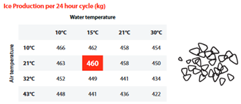 - Ice Production (kg/24h): 460kg based on air temperature of 21°c with incoming water temperature of 15°c